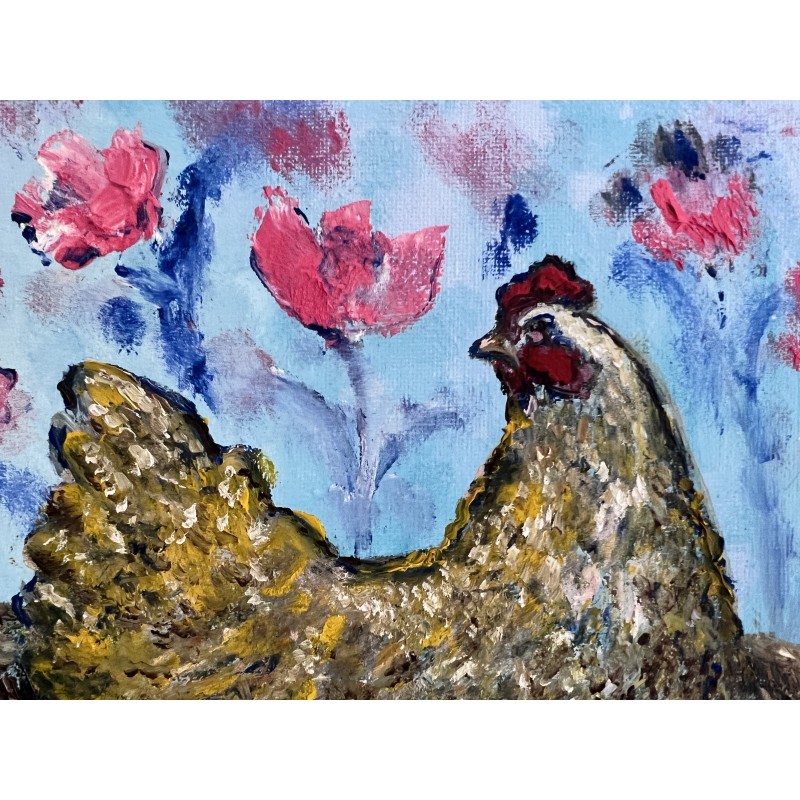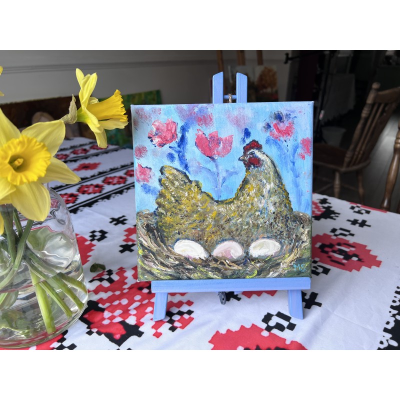 “Spring Hen in the Garden” is an intimate painting filled with warmth and quiet care. A mother hen sits in her nest above three eggs, carefully protecting new life that is about to appear. Soft pink blossoms on a blue background create the feeling of early spring, when the air is still fresh but nature is already awakening.