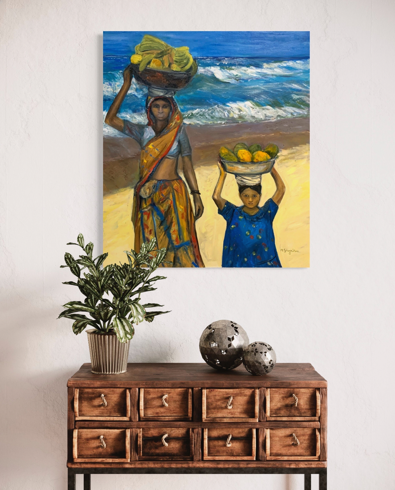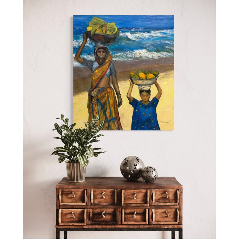 bowl of bananas, her eyes staring into the distance and her lips dry from the heat and wind. A girl is walking nearby, she is also carrying fruit on her head. Their path is decorated by the ocean, the wave runs one after another, the freshness of the reflection of the path of the companions, a little more and they reach the house and indulge in the long-awaited rest. This painting was created by the artist Marіna Stognieva and is part of a series of paintings dedicated to African themes.