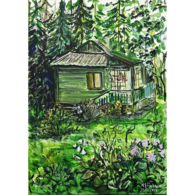 "Country House and Garden" is an original acrylic painting created by the Ukrainian artist Marina Stognieva in August 2022, after her return home to Kyiv, from the evacuation to Europe caused by the Russian attack. It is known that Ukrainian artists often gathered at the country house of artist Inna Artamonova, talked over lunch and tea, and created paintings. This house in the picture is Mrs. Inna's dacha.