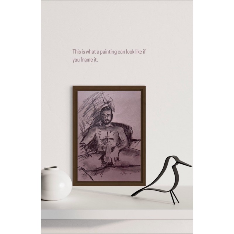 The portrait of a naked man with charcoal on paper was created by the artist Marina Stognieva in 2022. The portrait is drawn from nature, the man sits in a chair without clothes, you can see the beauty and strength of his body, we see a challenge in his eyes.