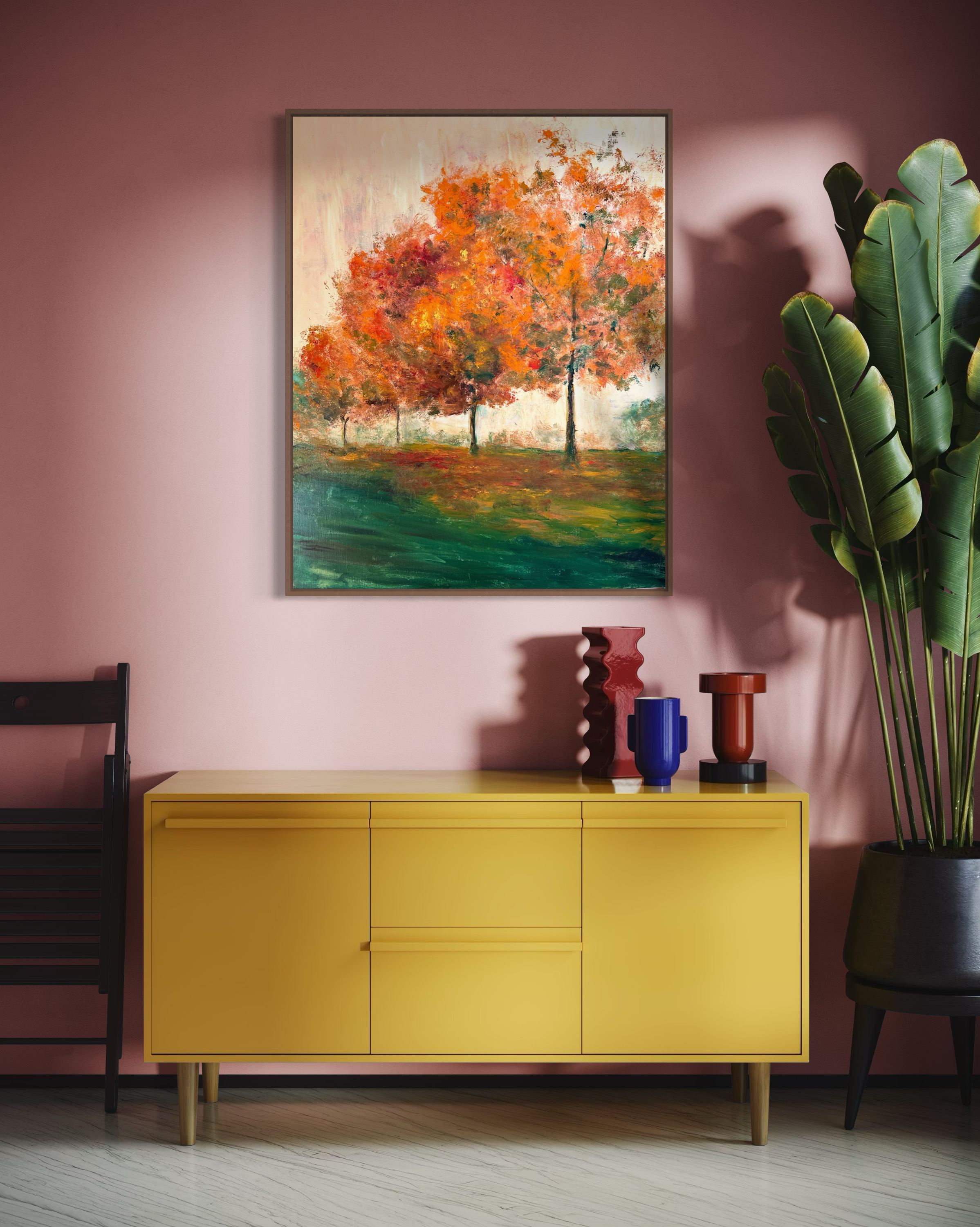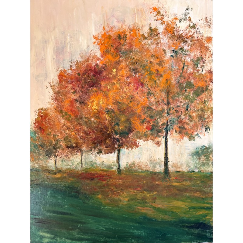 The colorful landscape "Breath of Autumn" was created by the artist Marina Stognieva in 2023-2024. The painting is painted with oil paints on canvas in an abstract style and is saturated with autumn colors. Thanks to the author's technique, we feel the breeze that walks along the crowns of trees and plucks yellowed leaves, it circles, enchanting with its dance.