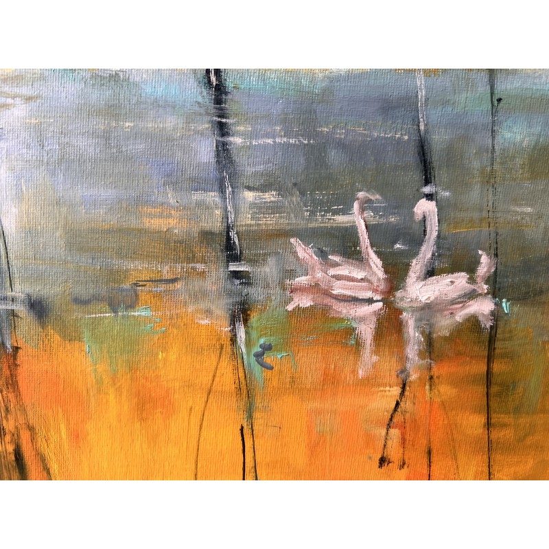 This original autumn oil painting features two graceful swans gliding across a peaceful lake, surrounded by vibrant golden trees reflected in the water. The deep forest background contrasts with the fiery colors of fall, creating a powerful visual balance between shadow and light.