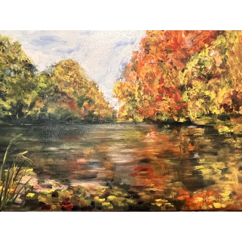The autumn landscape of the Ukrainian artist Marina Stognieva depicts the Aidar River winding through the colorful autumn forest, the crowns of trees are reflected in the calm waters, enchanting with their beauty.