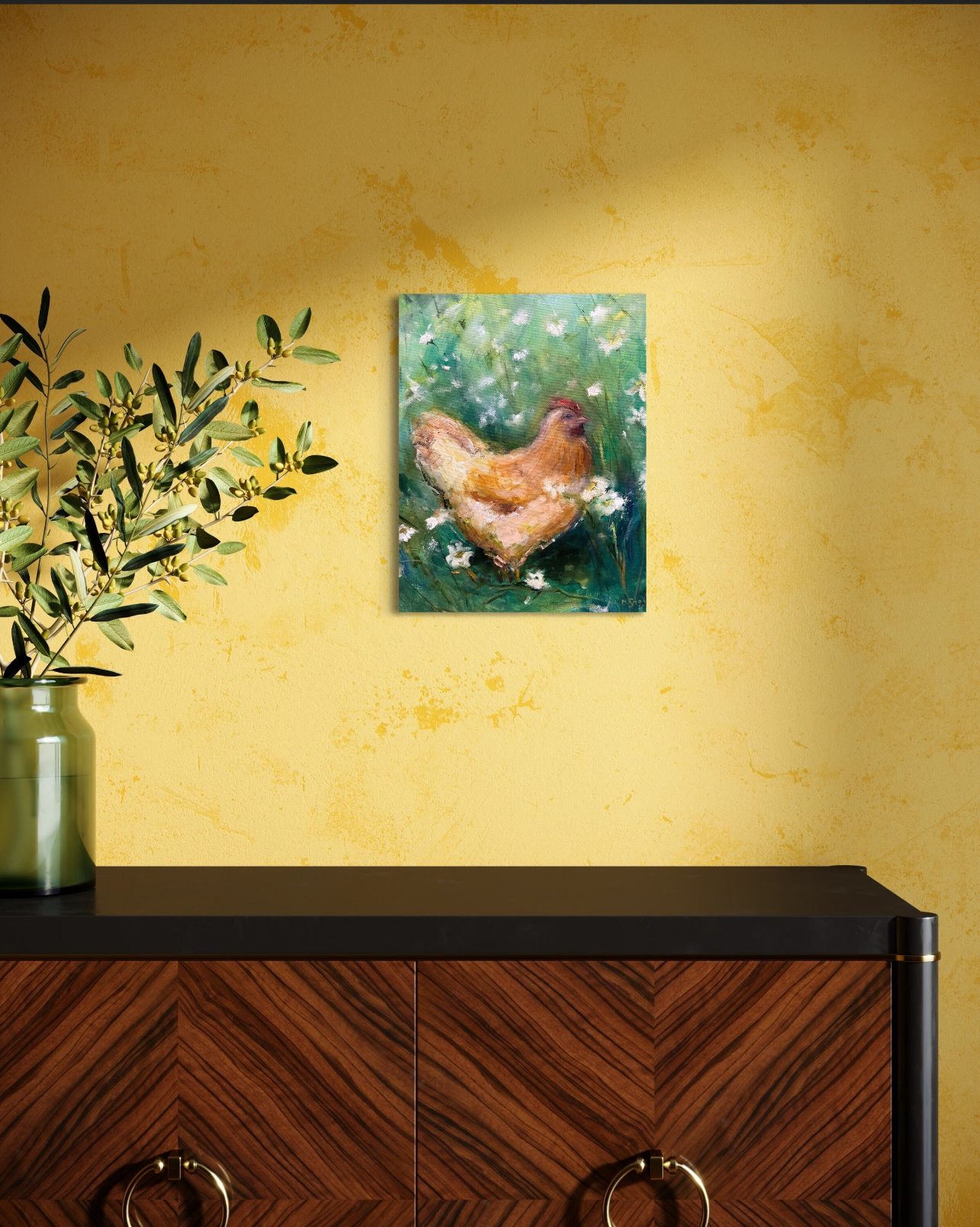 chicken. The painting was painted in oil on canvas, spring 2024.A cute chicken stands on the lawn among herbs and flowers. The artist notes that this series was inspired by her childhood in the village.