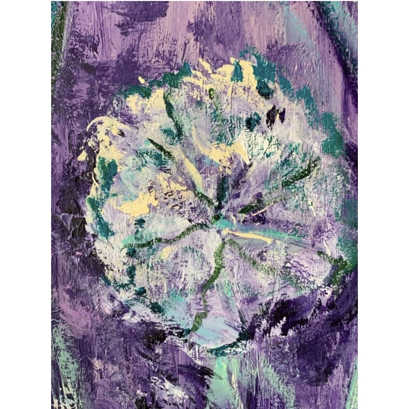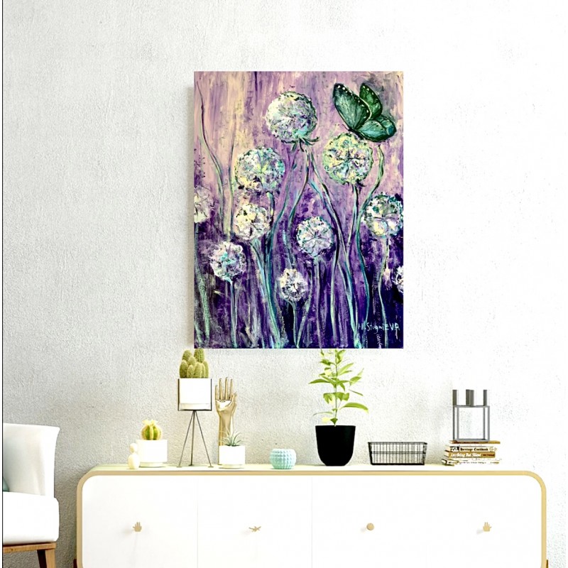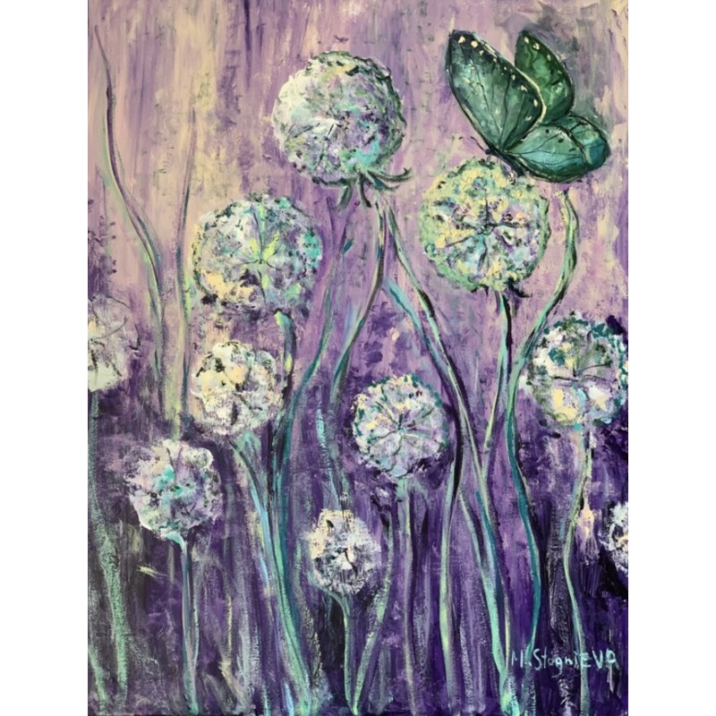 In this picture, we meet the purple sunset of fragrant summer in the field grasses. Airy, almost transparent dandelions, meekly stand admiring the June evening. A butterfly smoothly descended on one of the flowers, adding its beauty and lightness to the fascinating plot. The artist Marina Stognieva often refers to the theme of nature, her childhood in the village left many memories and now, decades later, these impressions are transferred by the author to the canvas.