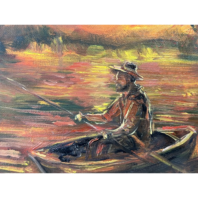 In Ukrainian Fisherman at Sunset, the artist captures a tranquil moment: a lone fisherman drifting in his boat under the glowing sky of dusk. The golden-red tones of the sunset reflect on the water, symbolizing peace, reflection, and unity with nature.