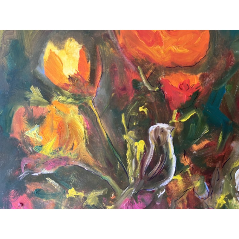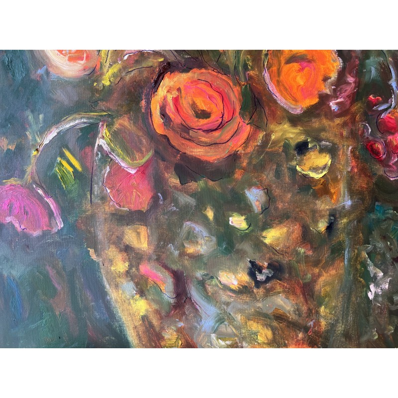 In this canvas, infused with emotional light, Marina Stognieva unveils a floral symphony where every brushstroke breathes. Lush petals — from fiery corals to soft pearlescent tones — break through the deep shadows of the background, reminiscent of a twilight garden before a storm.