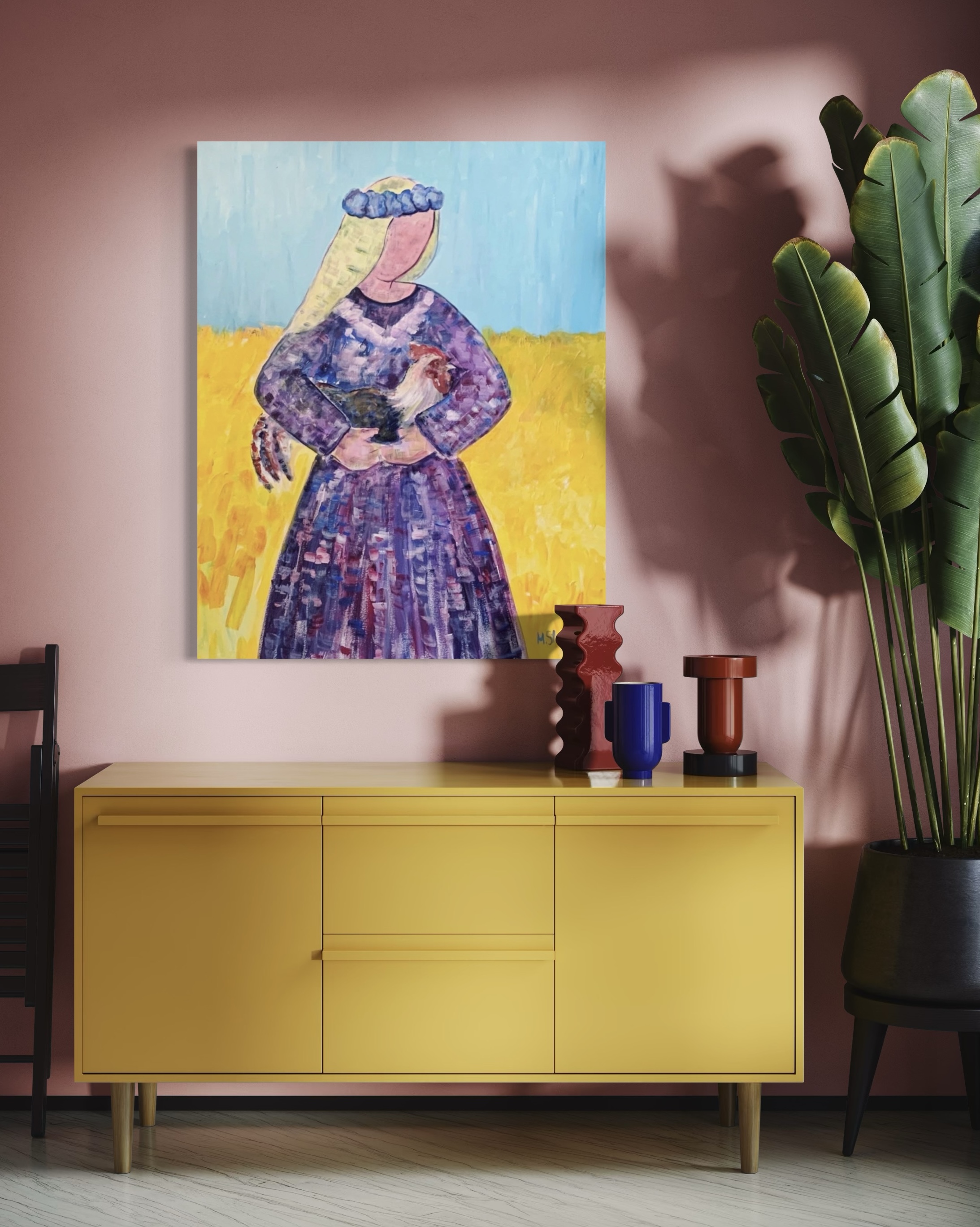 Stognieva, which is her self-portrait. The rooster is a symbol of dawn, awakening, the sun, spiritual rebirth. A wheat field and a cloudless sky are symbols of freedom and peace and serenity. The painting was done in ethnic style with acrylic on canvas 75*95 cm in February 2022.