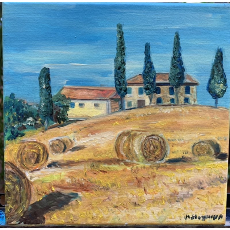 More than ten paintings by the artist Marina Stognieva were inspired by a trip to Italy in October 2019, among them the Tuscan landscape. The picture is filled with golden colors of autumn, the blue and cloudless sky symbolizes tranquility and serenity.