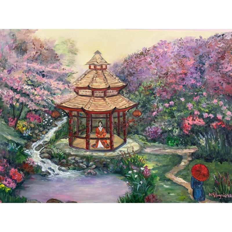 This painting by the artist Marina Stognieva takes us to the land of the rising sun - Japan. The picture depicts a wonderful garden: among the flowering sakura trees there is a small gazebo in which a girl in a traditional kimono stands. She enjoys the murmur of the stream, the aroma of herbs and feels peace while admiring a small pond, the banks of which are covered with delicate flowers. This original oil painting on canvas is available for purchase.