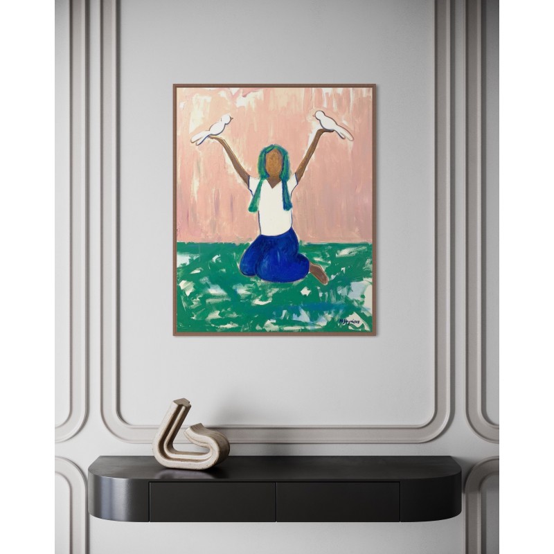 The original painting “Meditation with Birds” was created in acrylic on canvas by the