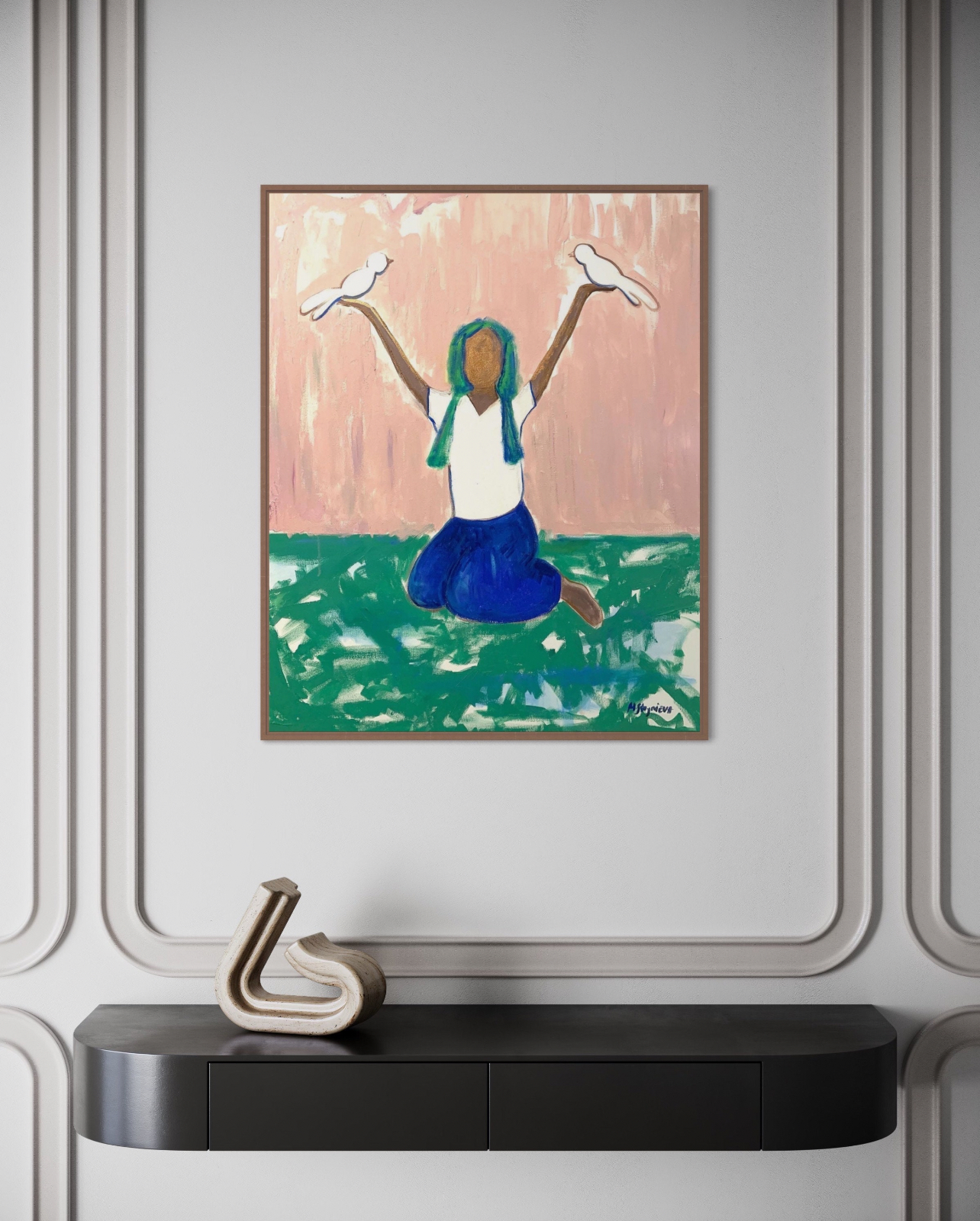 artist Marina Stognieva in February 2022. The canvas depicts a girl, she sits on the grass, her arms are outstretched, a bird-dove sits on each of the palms. This picture is very symbolic, the green color is the energy of life, the pink sky is the end of the day, the picture carries an atmosphere of harmony and tranquility. "Meditation with birds" Symbolizes peace and gratitude for another day lived.