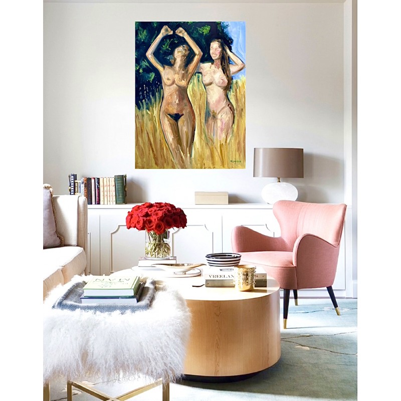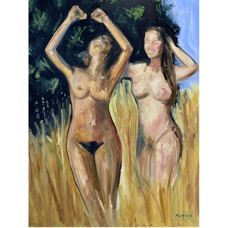The artist Marina Stognieva was inspired to create the painting by female beauty and cheerfulness. Two girls run across a wheat field, drink avidly on a summer day and rejoice with happiness. The picture is made in oil and executed in warm colors to convey the heat of a summer day from which you really want to throw off your clothes. The wheat field symbolizes the abundance of love, joy and friendship.