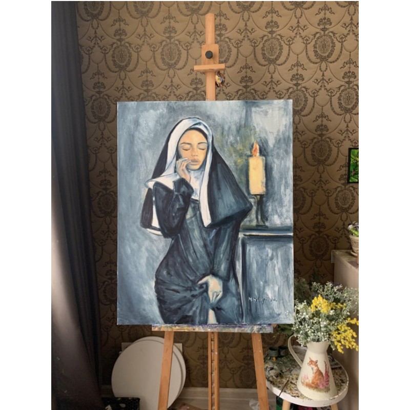 Oil painting on canvas "Slutty nun" was created by the artist Marina Stognieva in 2021. The canvas depicts a girl exhausted from desire, she lifted the hem of her dress and is very close to starting to caress herself. But according to religious teachings, she is convinced that this is something vicious and sinful, something that will close the gates to paradise forever. Will the girl decide to explore her body, sensuality and sexuality, or will religious teachings take over and she will lower the hem of her dress? The answer to this question can only be given by the viewer, relying on their feelings.